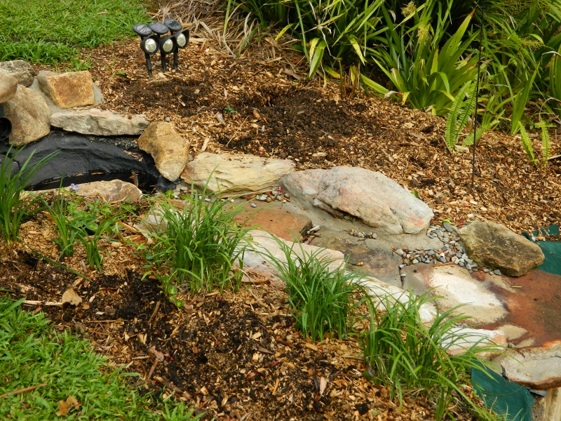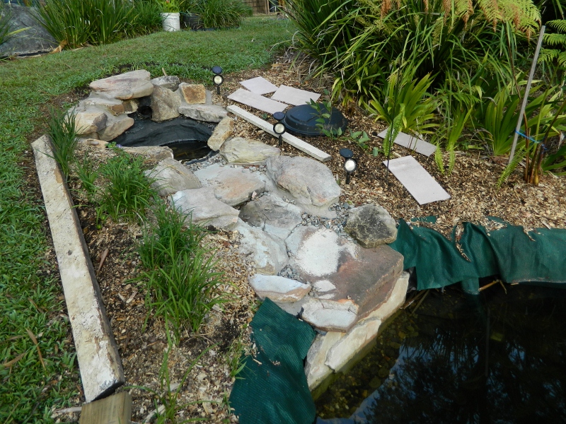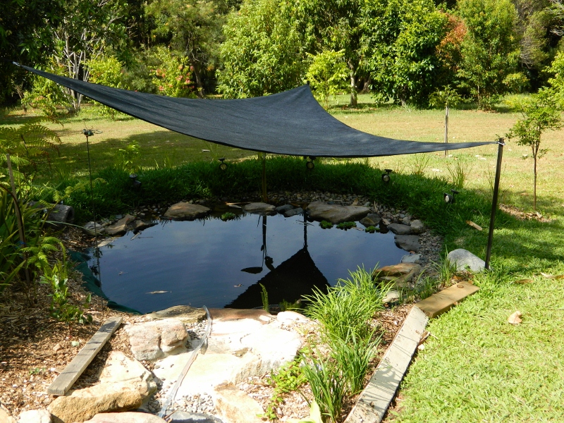 Then there was the algal growth caused by sunlight … I’ve had to install a shade sail to cover the pond until the tree-ferns grow big enough to take over. Again, not exactly the look I was after.