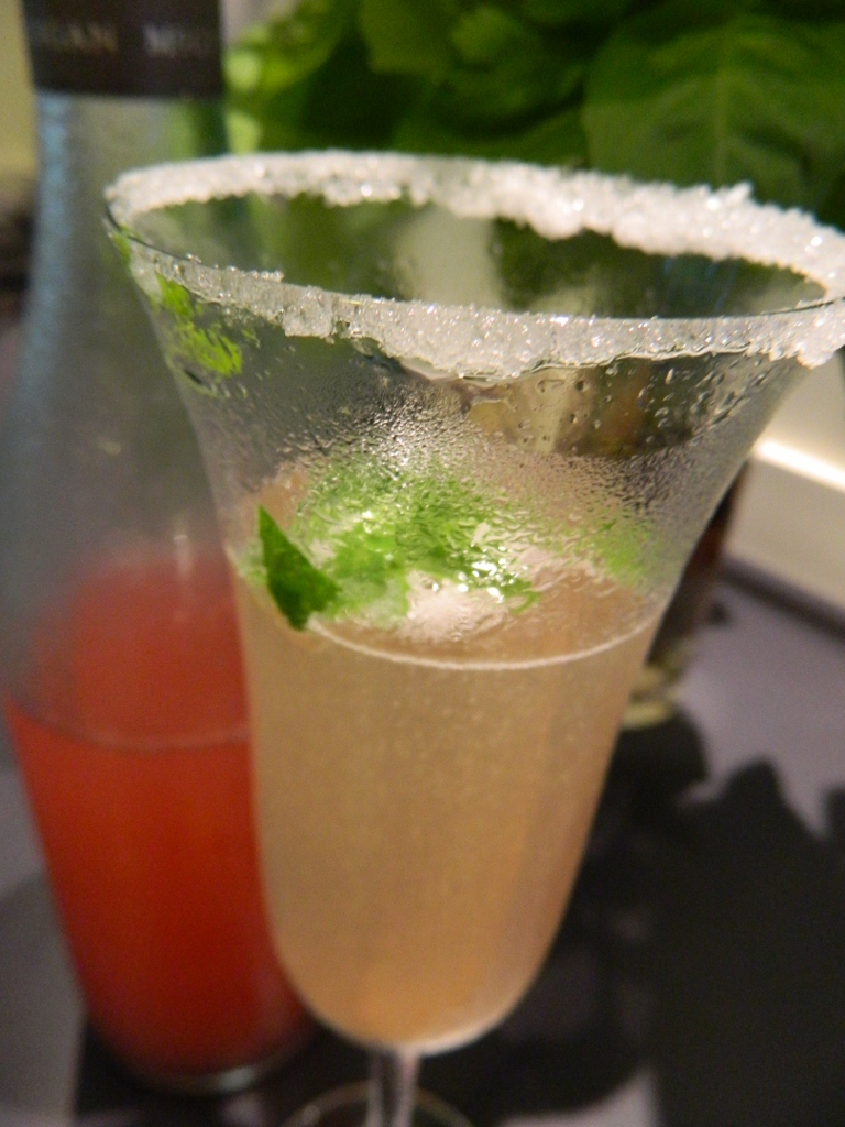 Take the bottle from the oven (mitts again) and pour in the hot liquid using a funnel. Seal and turn upside down for a few seconds. Allow to cool. As there are no preservatives (other than sugar) in the cordial, it should be kept in the fridge. You can make a “virgin” cocktail by adding fizzy lemonade instead of champagne.