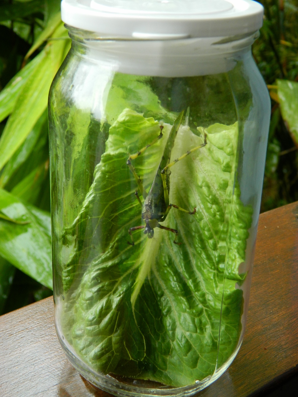 Then last night I heard a quiet chirp and a scratch of something against a fly-screen, so I grabbed my torch and went out to investigate … finally a katydid! And just the one I wanted to see, the 32 Spotted Katydid. So I popped it in a big jar with a lettuce leaf (for a bit of atmosphere) and left it in the kitchen overnight.