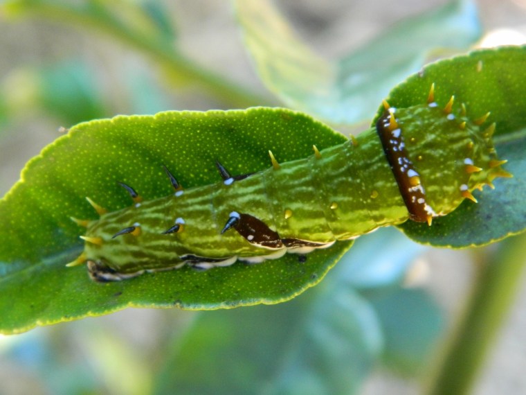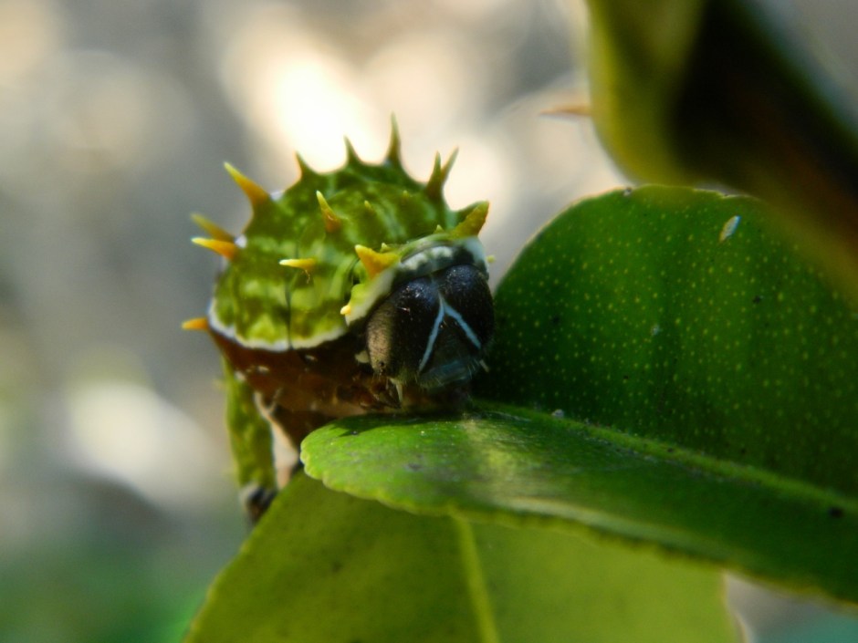 When is a pest not a pest? Well, when it’s as weird and colourful as a citrus caterpillar. I found this one sunning itself on my Kaffir Lime tree.