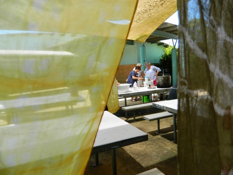 For five days, the ever patient Anne Leon guided us as we experimented with leaves, seeds, flowers, twigs and vegetables which we placed between layers of natural fabric and then wrapped around pvc pipe, folded, clamped or tied and dropped into simmering pots of lemon myrtle, eucalyptus, red cabbage and brown or red onion.