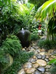 Dennis has transformed the gardens of three adjoining suburban blocks into a lush tropical garden paradise of winding paths, moss covered statues and pots, water features and displays of heliconias, gingers, frangipani, bromeliads, clumping bamboos and much more … every turn in the path reveals another “garden room” with it’s own water feature and collection of exotic plants. Even though the garden is only 1000 m2 (about a quarter of the size of mine) it feels like it goes on forever.