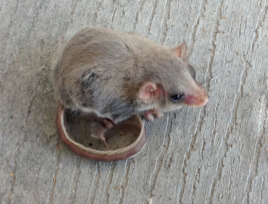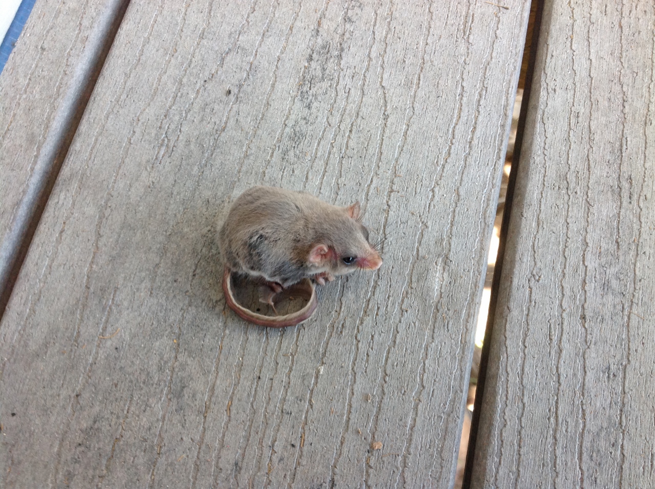 It turned up yesterday on the veranda of my friends Trish & Richard, looking a bit poorly. We think it might be an Eastern Pygmy Possum, a threatened species which weighs between 10 and 50 grams – that’s about the same as a normal chicken egg! You can see just how small it is when you compare it to the width of the decking in the photo below.